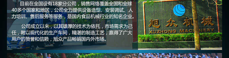 廣州旭眾食品機(jī)械有限公司是一家集科研開發(fā),生產(chǎn)設(shè)計(jì),營銷服務(wù)為一體的現(xiàn)代化生產(chǎn)企業(yè)。現(xiàn)代化生產(chǎn)車間,精湛制造技術(shù),所產(chǎn)機(jī)械歷經(jīng)市場重重考驗(yàn),不斷贏得海內(nèi)外客戶的贊譽(yù)。
