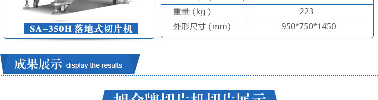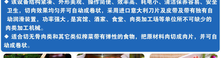 SA-350H 全自動(dòng)落地式切片機(jī),適合切無(wú)骨肉類(lèi)和其他類(lèi)似榨菜帶有彈性的食物,把原材料肉切成肉片,并可自動(dòng)成卷狀??汕信H馄?、羊肉片等