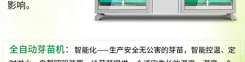 芽苗機(jī)系列,全自動芽苗機(jī):智能化一生產(chǎn)安全無公害的芽苗,智能控溫、定時淋水、自帶照明裝置,給芽苗提供一個適宜生長的溫度,濕度,個人即可輕松搞定,實現(xiàn)每天循環(huán)生產(chǎn)芽苗!