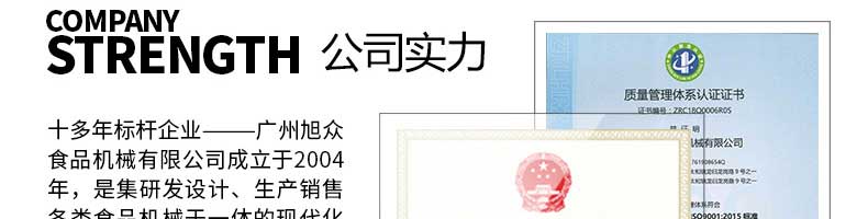 廣州旭眾食品機(jī)械有限公司是一家集科研開發(fā),生產(chǎn)設(shè)計,營銷服務(wù)為一體的現(xiàn)代化生產(chǎn)企業(yè)?,F(xiàn)代化生產(chǎn)車間,精湛制造技術(shù),所產(chǎn)機(jī)械歷經(jīng)市場重重考驗,不斷贏得海內(nèi)外客戶的贊譽(yù)。